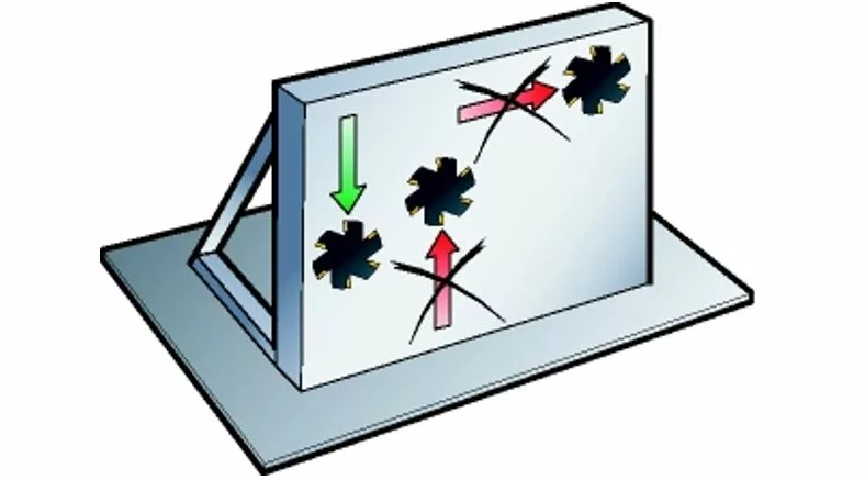 When using a 90° milling cutter, cutting forces are mainly radial. This causes tool deflection in long overhang applications; however, low axial forces are advantageous when milling thin-walled/vibration-sensitive parts.